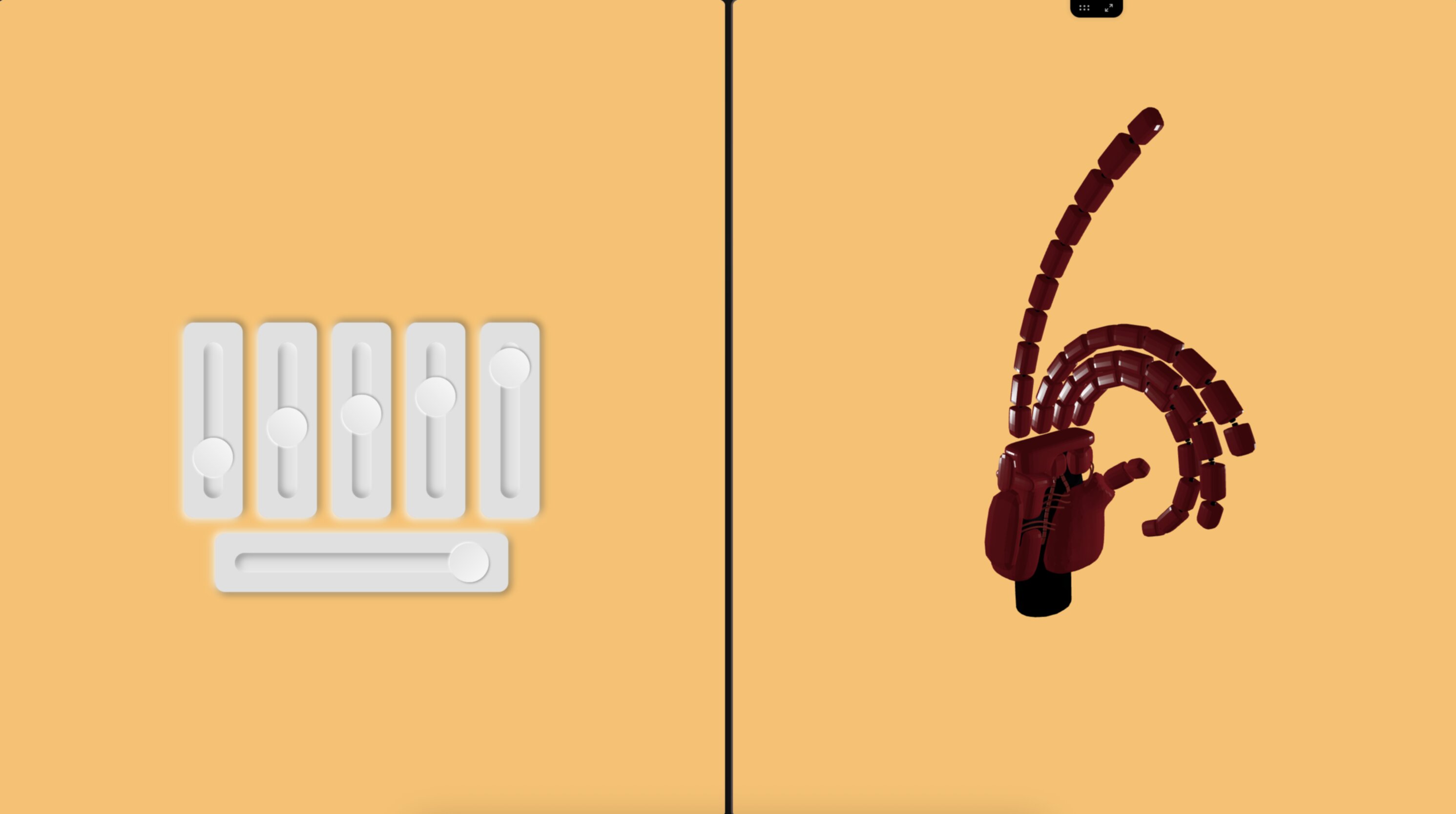The application features a 3D hand with five fingers, modeled and rendered directly in the browser. A separate controller interface, accessible via a different URL (/controls), allows real-time control of the hand. Through this controller, the fingers can be individually moved and their length adjusted.